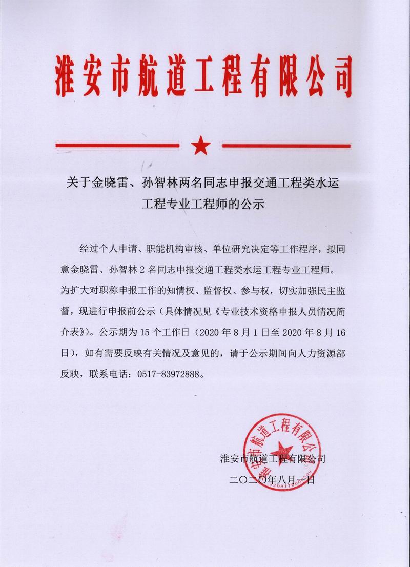 關(guān)于金曉雷、孫智林兩名同志申報交通工程類(lèi)水運工程專(zhuān)業(yè)工程師的公示